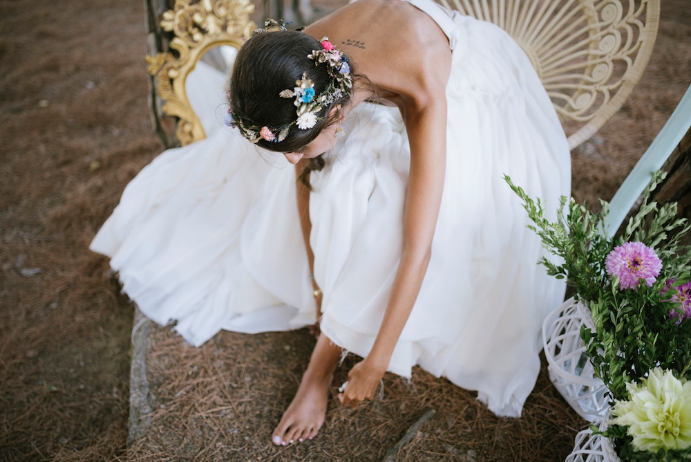 Monica la mariée était simplement parfaite avec son crop top et sa longue jupe. Une couronne de fleurs séchées venait completée son look. Les demoiselles d'honneur portaient des bracelets de fleurs dans la même palette de couleurs. Les bijoux, un petit détail de la mariée à ses amies: des boucles d'oreilles et une grande bague d'améthyste, et un ensemble de bijoux travaillés artisanalement en argent et cristal de quartz. La mariée portait une petite collection de bagues de fiançailles vintage, et des boucles d'oreilles de la collection Lotus Flower, élaborés artisanalement en argent et or de 24kt pour la même créatrice, Marta, une super artiste.