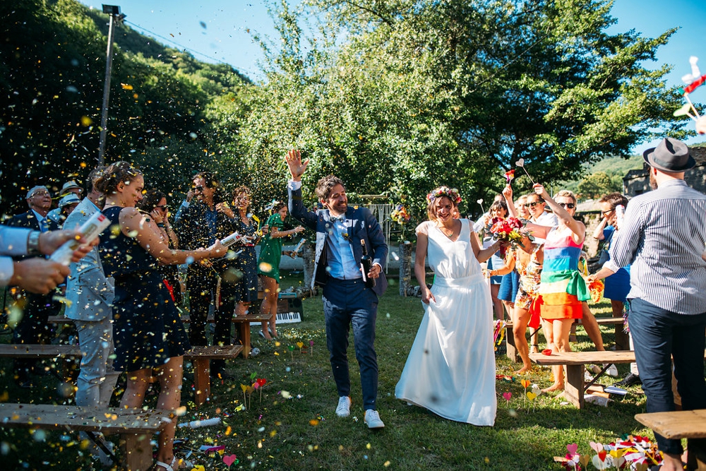 Pour la déco nous avons fait beaucoup de choses nous même, aidée de mes supers témoins et de ma famille (guirlandes de fanions, confitures, baguettes cérémonie, macramé...) . Romain étant graphiste a fait principalement la papeterie ;). Nous avons choisi des couleurs vives pour amener de la gaiété et de la bonne humeur à la deco.