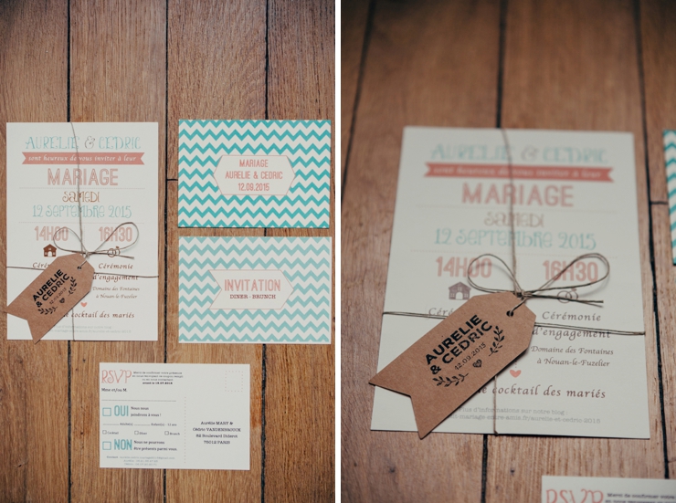 Le fil conducteur de notre mariage était le naturel qui collait parfaitement au lieu et à l’esprit que nous voulions retrouver. Nous voulions quelque chose de simple, qui nous ressemble. Nous avions une déco assez champêtre à laquelle nous souhaitions ajouter des touches de couleurs verte et corail. Couleurs que nous retrouvions dans nos éléments de déco et nos compositions florales mais aussi… sur les tenues de nos témoins : les garçons en superbes pantalons vert, nœuds pap assortis et les filles en magnifiques robes corail. Ils étaient très beaux et parfaitement dans les tons du mariage.