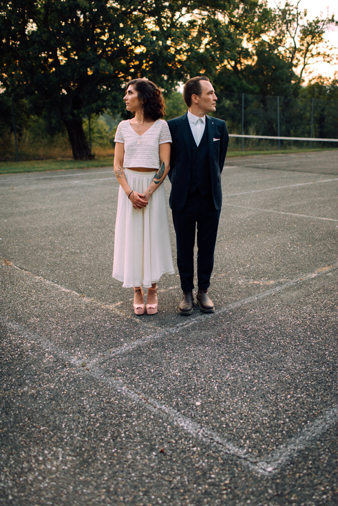 Nous nous sommes rencontrés en 2018, alors qu’Alex vivait à Berlin et moi à Paris. Ça a été un coup de foudre immédiat qui nous a permis d’affronter toutes les difficultés, et de tenir le coup à distance. En 2020 nous avons emménagé ensemble à Lyon, où nous avons vécu le confinement alors qu’on avait jamais été ensemble plus de 10 jours d’affilée… Ça a été un excellent test. Je n’arrêtais pas de le tanner depuis des années pour qu’on se marie, tout en sachant que ce n’était pas trop son truc. Et, surprise, début 2022, à 4h du matin en pleine soirée techno, il me sort une toute petite bague de sa poche de jean, et me hurle dans l’oreille « je veux me marier avec toi !! ». C’est assez improbable et en même temps totalement nous 🙂