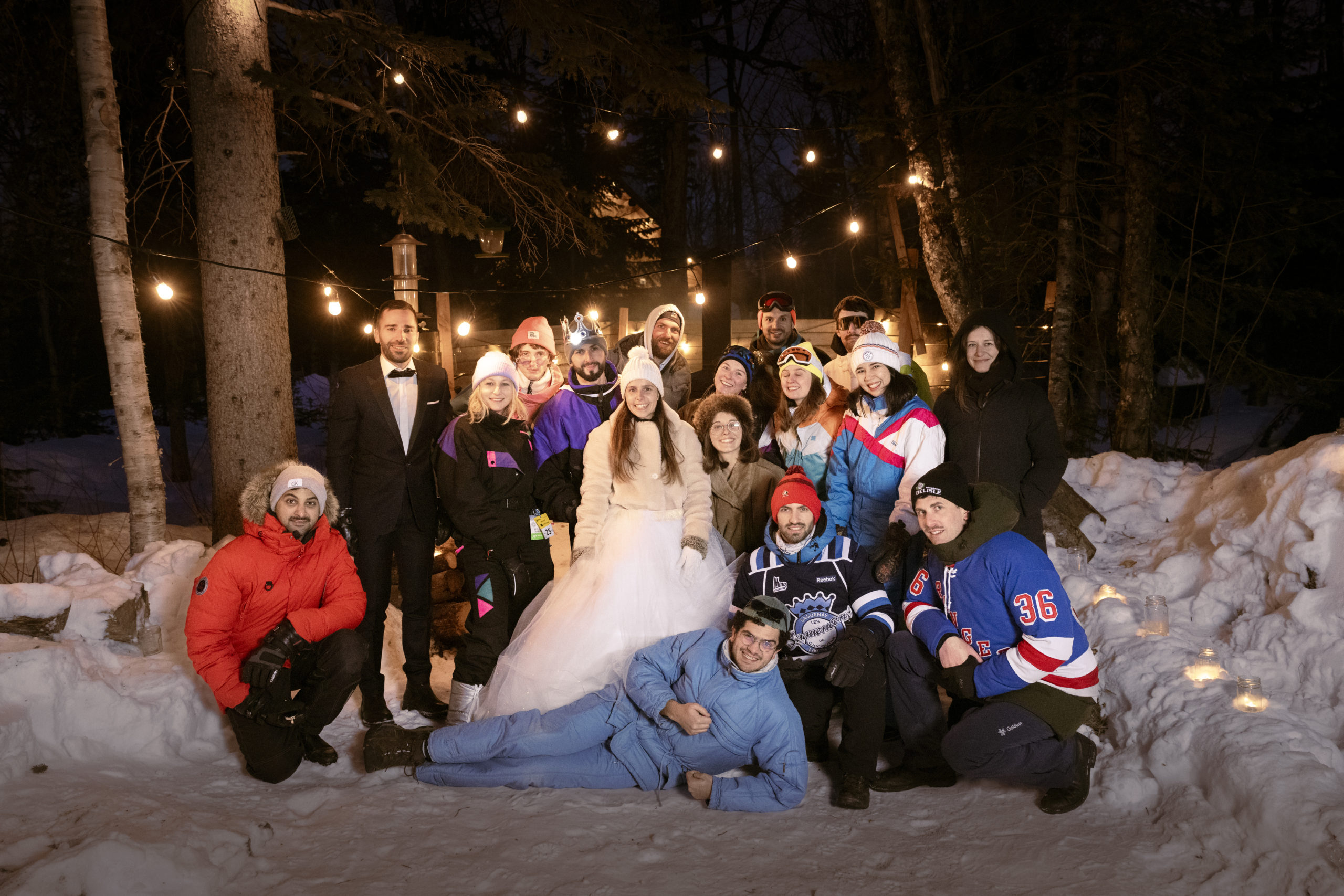Quelle belle idée de mariage ! Intimiste, chaleureux et plein de personnalité, ce genre d’événement montre qu’il n’y a pas besoin de chichis pour célébrer l’amour. Les tenues de ski par -20°, c’est vraiment l’esprit hivernal au max !