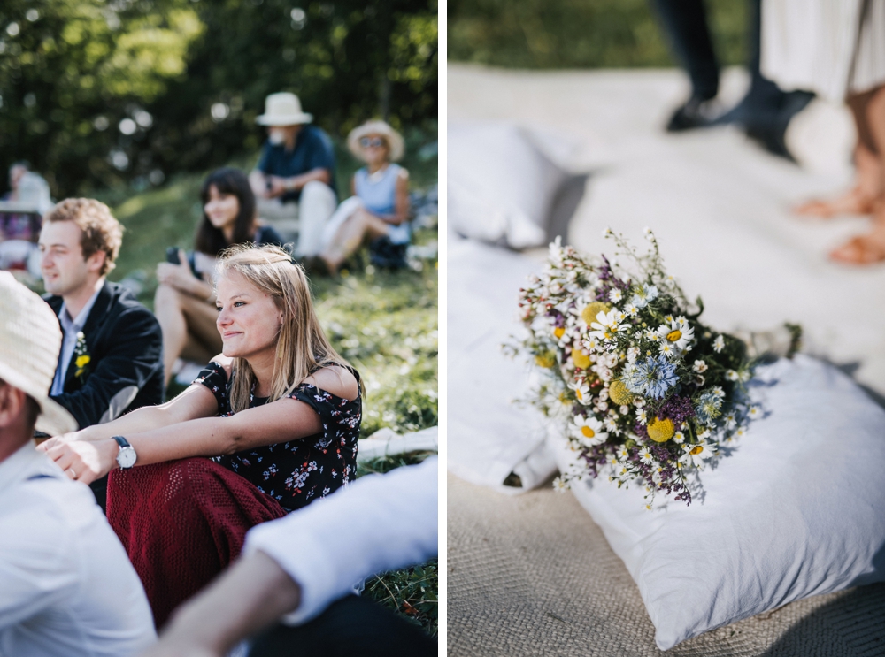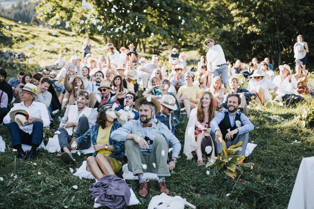 Coussins: Comme le mariage se passait dans un alpage en altitude, et qu’on ne pouvait pas monter 120 chaises là en l’air, on a remplis des coussins de foins que le fermier d’à côté nous a “prêté”. Ils ont aussi servis pour la soirée cinéma la veille et pour le brunch du lendemain.