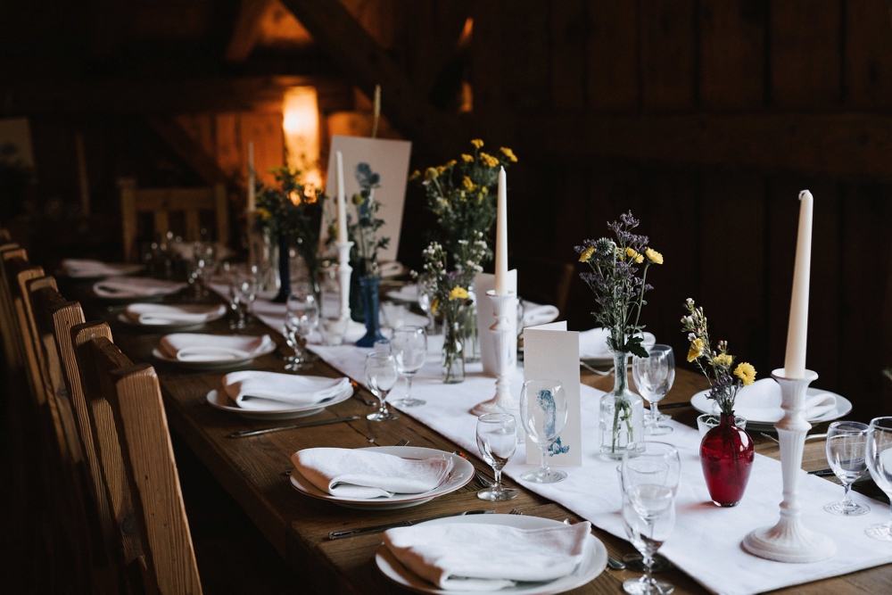 Tables: Juste quelques fleurs (de saisons et de montagne) dans des petits vases collectés dans des marchés aux puces à env. 1 euro pièce.