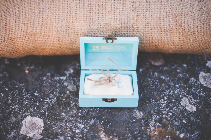 Nous avons dessiné les faire-parts et la papeterie et nous avons fait plein de petites choses pour la déco: les attrapes-rêves à accrocher aux arbres du petit foret avec des dentelles et des rubans, les petites étoiles bleues en papier de soie que la nièce de Jose lançait partout, le coffret pour les alliances, l'affiche en bois annonçant l'arrivée de la mariée, les pompons, collecter des pommes de pin et bouteilles d'huile d'olive pour les centres de table, trouver des cartes postales antiques de villes d'Europe et des timbres belges pour les faire-parts aux brocantes...