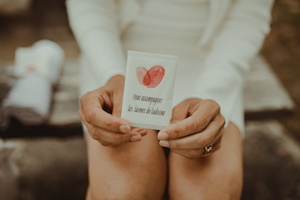 Au dîner nous avions prévu des cartes de placement personnalisées avec une photo d’un moment clé avec la personne et un texte personnel. Les invités ne s’y attendaient pas et cela a été un des moments les plus émouvants du mariage. Les pleurs et câlins ont fusé de toute part !