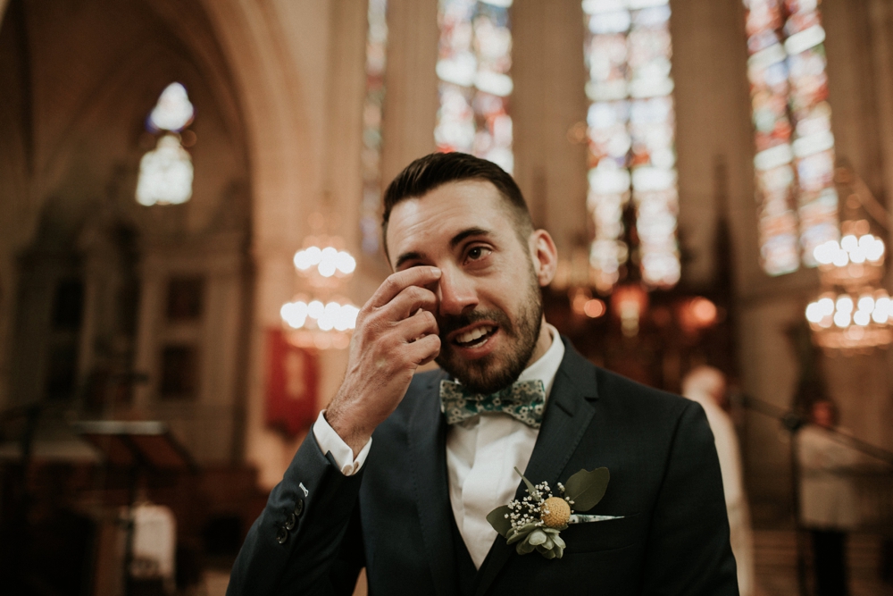 Si il y a bien une chose qu’on ne peut pas reprocher à Violette, c’est d’avoir choisi à la va-vite et de manière impulsive sa robe de mariée ! Je ne saurai dire le nombre de fois où j’ai entendu Violette me dire qu’elle avait un essayage avec telle ou telle personne etc. Donc autant dire que je savais que la chose avait été très minutieusement préparée et choisie. Dernière crainte de ma fiancée avant de la revêtir le jour J : que notre appartement brûle avec la robe à l’intérieur … Non pas qu’il y ait pourtant un risque d’incendie accru en région parisienne au mois d’avril … Bref tout ça pour dire que s’il y a une chose dont j’étais sûr et certain pour ce jour, c’était bien que ma future ait PARFAITEMENT choisi sa robe à son image, pour qu’elle resplendisse à l’intérieur de celle-ci. Et je ne fus pas déçu … Il est un peu plus de 15h30, et je viens d’arriver devant l’autel de l’église. Déjà dans un autre monde je crois apercevoir nos témoins défiler à ma suite avant que mon regard ne se fixe au loin, dans la lumière émanant de l’entrée de l’église. Et là je l’aperçois, resplendissante et le regard rivé sur moi au milieu de tous. Puis elle avance, j’ai l’impression qu’elle vole dans sa robe vers moi au son de la musique chargée d’émotion. Cette même émotion qui m’envahit comme jamais car j’ai alors ce sentiment profond de ressentir l’unicité du lien entre nous. Cette robe est parfaite et tellement à son image, je ne vois qu’elle. Mon amour pour elle est alors si débordant que je ne peux le contenir, et ces larmes qui coulent sur mes joues à ce moment-là sont aussi unique que la robe qui s’avance vers moi. Ce regard, ce sourire …un moment de bonheur tout simplement parfait.
