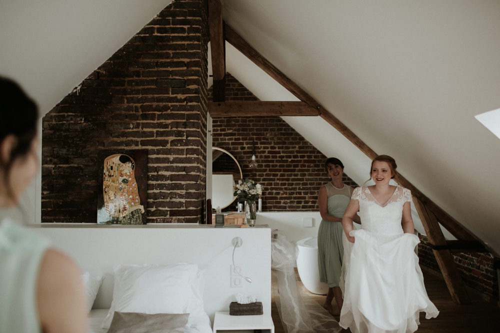 Coiffure et maquillage : Nous sommes arrivés sur place dès le vendredi. Il n’y a pas d’hébergement au Château de la Trye. Nous avons donc trouvé une maison d’hôtes à Beauvais. Toutes chambres étaient occupées par nous et nos témoins. Pour la coiffure, j’avais une idée assez précise. Une couronne de fleurs pour le mariage civil avec une coiffure semi-attachée et un chignon flou avec une tresse pour le religieux et sublimer mon voile ! Pour le maquillage, je me suis beaucoup appuyée et laissée guider par Gwen de chez The Reporthair. Je voulais quelque chose qui me ressemble mais aussi qui marque le coup pour ce jour si spécial. J’ai réalisé un essaie chez moi 1 mois avant le mariage. Cette première rencontre est un tellement bon souvenir ! Gwen est arrivée toute souriante et pleine de bonnes idées. On a passé 3 heures à discuter de beauté, mariage et un tas d’autres choses ! J’ai eu la sensation de passer l’après-midi avec une amie ! Très vite je me suis sentie en confiance et me suis appuyée sur ses conseils d’experte. Gwen a réussi à me faire me sentir belle pour le jour J et je pense que c’est le plus important pour une mariée ! Avec Reporthair, on a la sensation d’être dans une petite bulle. Marie est à l’écoute, bienveillante et disponible par mail avant l’essai et le jour J nous n’avons plus qu’à nous détendre et profiter de ce moment de bonheur. Pouvoir se préparer à domicile est un gros plus, j’ai profité pleinement de ma matinée de mariage dans le calme avec mes témoins. C’est un souvenir chargé d’émotions !