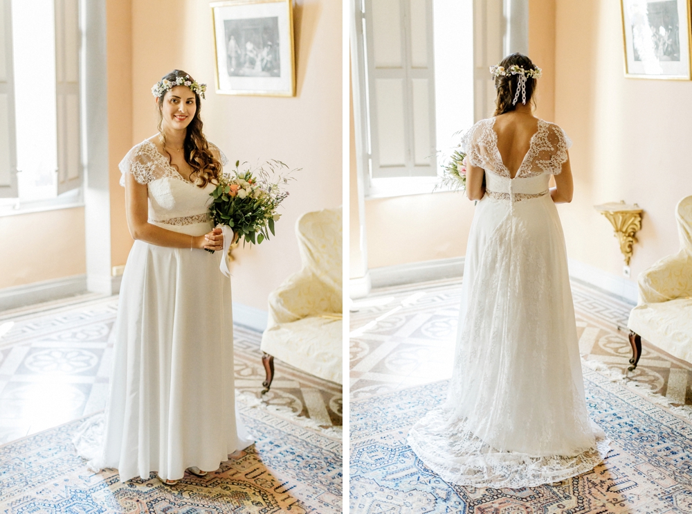 Robe de mariée : La recherche de la robe fût pour moi un vrai défi ! N’étant pas très à l’aise avec mon corps, cette étape m’angoissait terriblement et j’ai tout fait pour la repousser au plus tard possible. Nous avons l’habitude de voir dans les magazines des mariées physiquement parfaites qui peuvent tout se permettre et je ne me sentais pas assez à l’aise pour faire des essayages. Comme nous avions tout personnalisé dans le mariage et fait appel à des artisans locaux, je souhaitais faire la même chose avec mes 2 robes de mariées (civil et laïque). En tombant sur le site de la créatrice de robe sur-mesure Marynea, j’ai craqué sur son style bohème et raffiné.